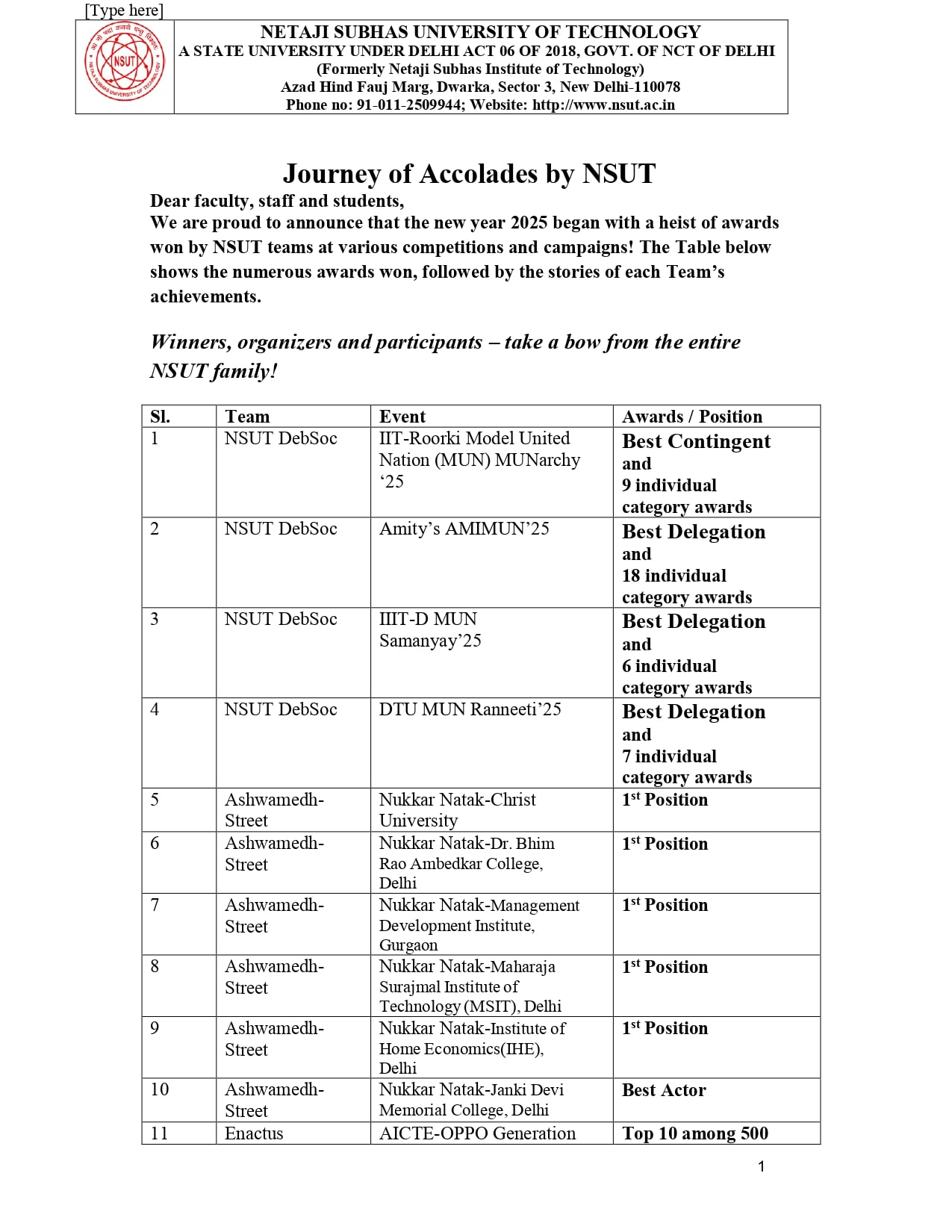 | Awards achievements and organizational efforts of NSUT Societies . Feb March 2025; - .